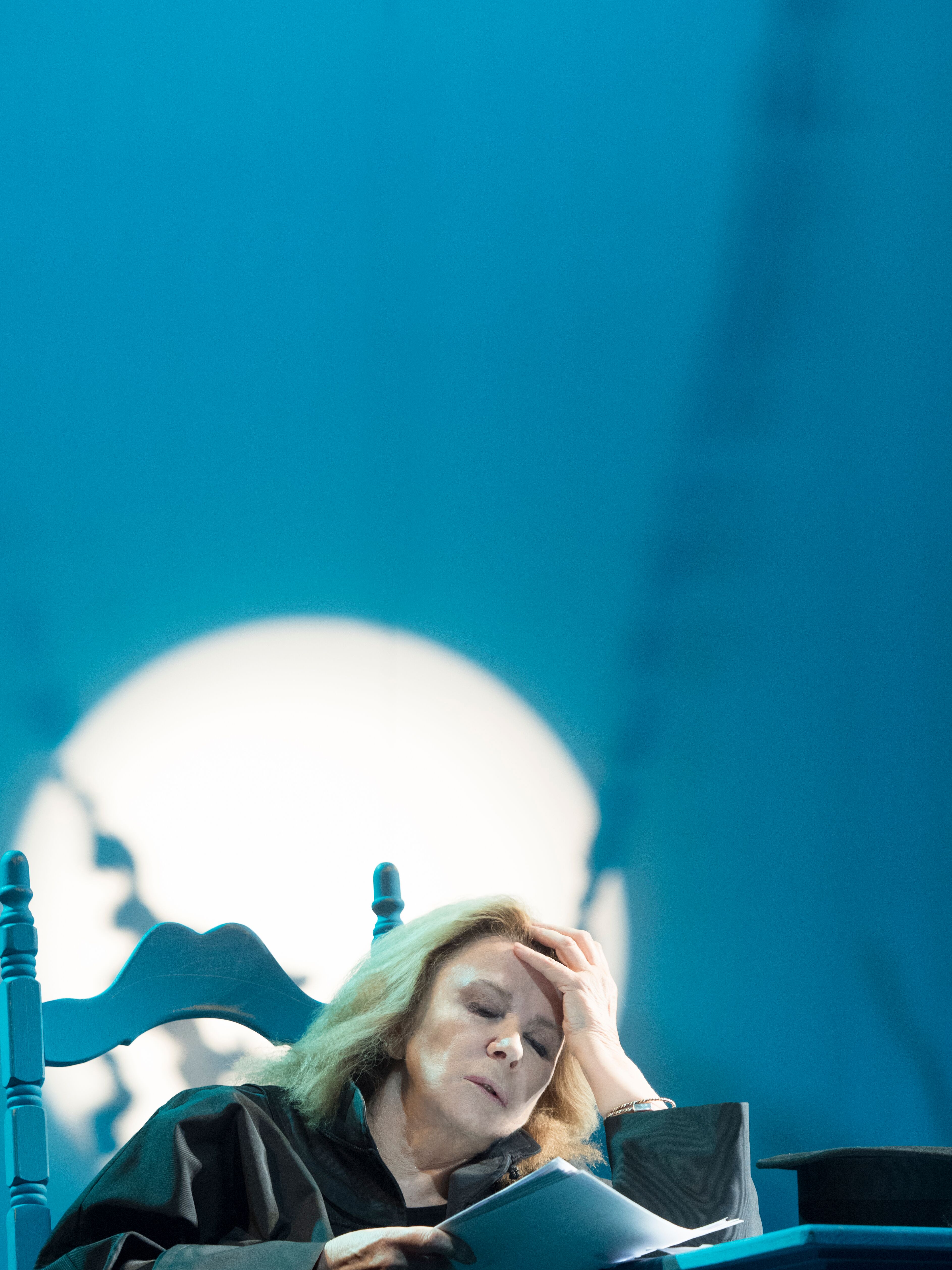 Спектакль построен так, что изумления накатывают на зрителя волнами: едва закончилась одна — набегает другая. Первое изумление — это Алла Демидова. Это какая-то новая Демидова, не та даже, что была в пермском «Носферату». Её манера игры в этом спектакле — сторителлинг заоблачного уровня. С одной стороны, это просто рассказ истории, с другой — нечто, наводящее на мысли о творчестве рапсодов и каких-нибудь «манасчи» — профессиональных сказителей эпоса: хрипловатый голос, мерный ритм, сильные, драматичные акценты, завораживающие жесты — руки помогают голосу.