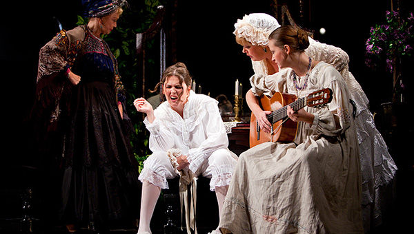 Спектакль похож на блюдо в дорогом ресторане, где горькое искусство уравновешивается сладким, а кислоту перебивают пряности. Неизменно интеллигентное (что бы он ни придумывал, а тут он ничего особенного и не придумывает) оформление Олега Шейнциса урезонивает громкий хор сенных девушек и дворовых юношей, который не замолкает, кажется, ни на минуту, откровенно эстрадные номера в исполнении незадачливых женихов соседствуют с мистической игрой зеркалами, откуда то смотрят те же женихи, пугая невесту, то вываливается Кочкарёв в неотразимом исполнении Михаила Филиппова. Художественная эклектика спектакля напоминает модный стиль «фьюжн», сочетающий несочетаемое, что делает его важной составляющей не столько театральной, сколько светской жизни.