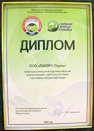 В Прикамье подведены итоги Года охраны окружающей среды. За успешное внедрение объектов альтернативной энергетики ООО «ЛУКОЙЛ-Пермь» отмечено наградой Министерства природных ресурсов, лесного хозяйства и экологии Пермского края.