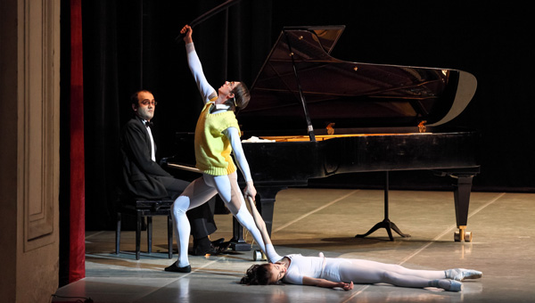 «Концерт» — редкий образец комедии в балете; его ещё называют балетом-шаржем. Сюжет спектакля порхает между вставными новеллами. Ироничный тон «Концерту» задаёт пианист (солист оркестра MusicAeterna Артём Абашев), который, садясь за инструмент, сдувает с него вековую пыль. С первых нот в его фантазиях рождаются необыкновенные сценки, навеянные музыкой: экзальтированная балерина в шляпе, замирающая в обнимку с роялем; танцовщицы, путающиеся в движениях и сталкивающиеся в прыжках; супружеская чета, в которой муж разрабатывает варианты по устранению надоевшей супруги и замены её на тонконогую возлюбленную, которая, в свою очередь, представляет себя бабочкой... Когда, повинуясь разыгравшемуся воображению, пианист бросает клавиши и хватается за сачок, зал разрывается аплодисментами.