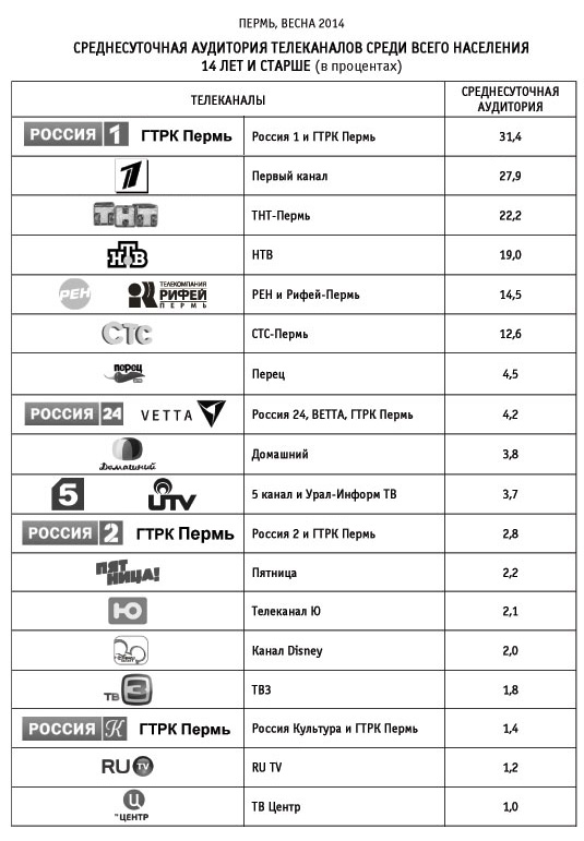 Институт «УралИНСО» обнародовал 24 апреля результаты социологического исследования аудитории теле- и радиоканалов, а также газет и журналов Перми «Весна-2014». Исследование проводилось в конце марта-начале апреля.
