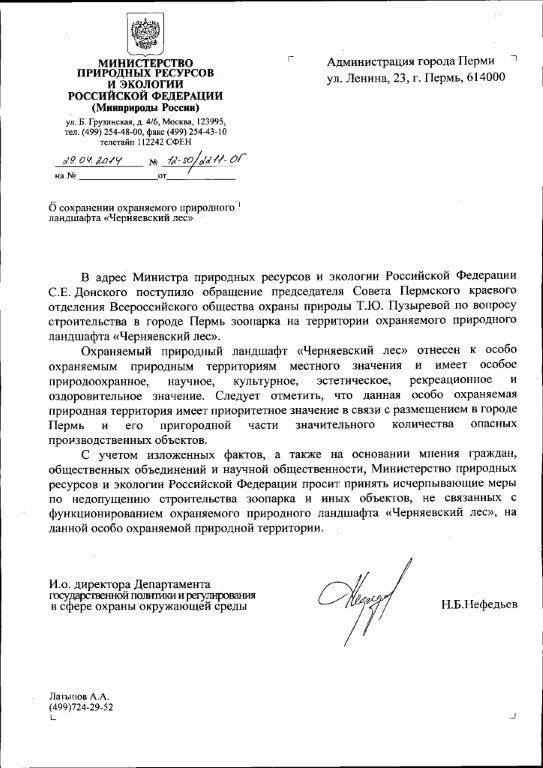 «С учётом изложенных фактов, а также на основании мнения граждан, общественных объединений и научной общественности, Министерство природных ресурсов и экологии РФ просит принять исчерпывающие меры по недопущению строительства зоопарка и иных объектов, не связанных с функционированием охраняемого природного ландшафта «Черняевский лес», на данной особо охраняемой природной территории», — говорится в письме.