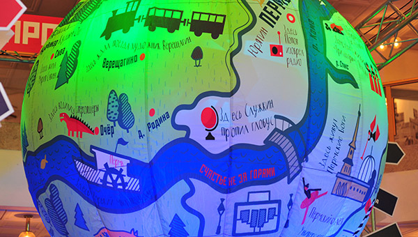 Глобус Пермского края, который встречал гостей в фойе концертного зала, раскрыл идею «Пермь — это целый мир» и стал аллюзией к произведению Алексея Иванова.