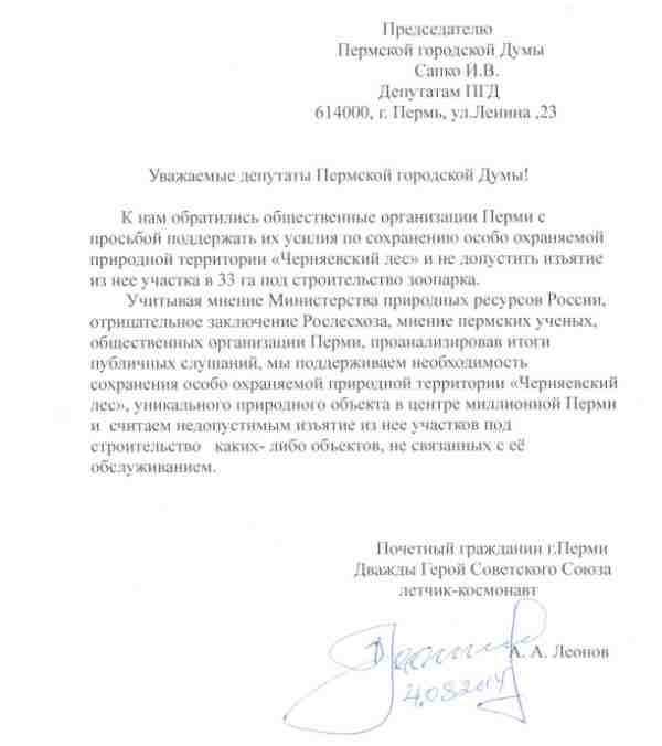 В Пермскую городскую думу поступили письма в защиту Черняевского леса от почётных граждан Перми, российских космонавтов Алексея Леонова и Виктора Савиных, а также от почётного гражданина Пермской области, бывшего губернатора Геннадия Игумнова.