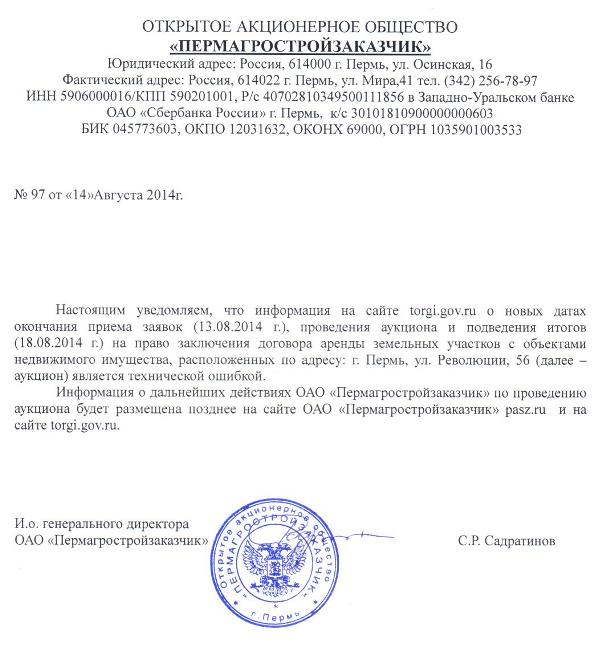 ОАО «Пермагростройзаказчик» оповестил потенциальных участников торгов о том, что дата аукциона на аренду земли в квартале №179 в Перми ещё не назначена.
