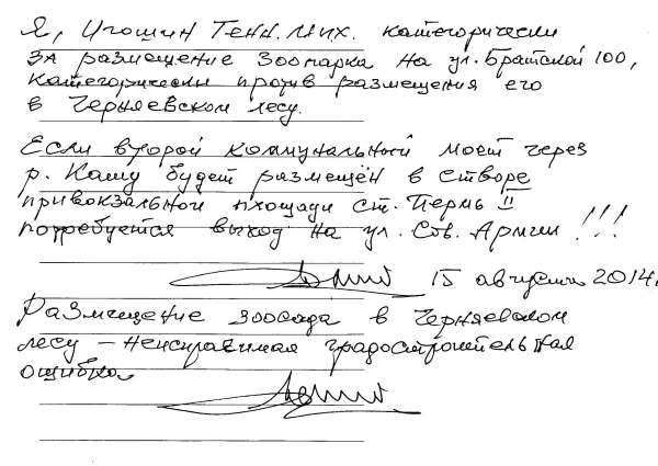 «Я категорически за размещение зоопарка на ул. Братской, 100, категорически против размещения его в Черняевском лесу... Размещение зоопарка в Черняевском лесу — неисправимая градостроительная ошибка», — цитирует Аверкиев письмо Игошина.