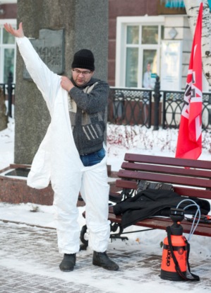 Объяснив происходящее на видеокамеру, первый секретарь Пермского краевого комитета ЛКСМ РФ Сергей Андреянов заявил, что проведёт «санитарную обработку площади». Продемонстрировав собравшимся дуст, активист облачился в защитный костюм и достал заранее приготовленный распылитель.