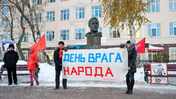 Участники пикета развернули транспарант с надписью «День врага народа», а также водрузили в снег два красных флага, дополнив их парой карикатур.