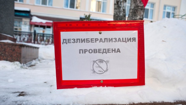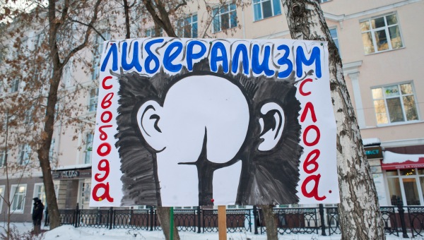 В завершение акции Андреянов оставил на площади табличку с надписью «Дезлиберализация проведена».