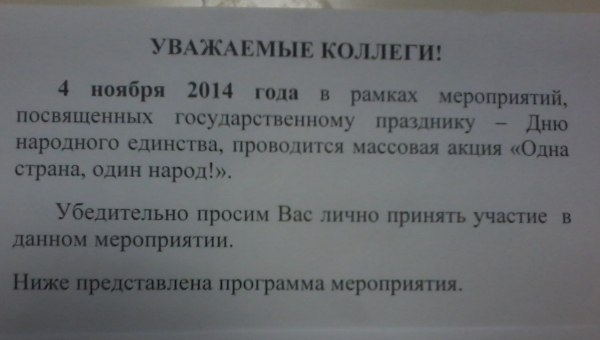 В последний рабочий день перед праздниками все руководители учреждений, подведомственных Министерству культуры Пермского края, получили письмо из орготдела ведомства с указанием в полном составе явиться на «народный сход «Одна страна, один народ».