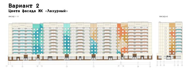Второй вариант — смелое дизайнерское решение, в геометрическом рисунке объединяющее на фасаде одного дома лазурную гамму и палитру тёплых цветов. Переходы от голубых оттенков к солнечным тонам будут близки тем, кто ассоциирует название «Лазурный» с морской тематикой, где волны и солнце образуют единый образ.