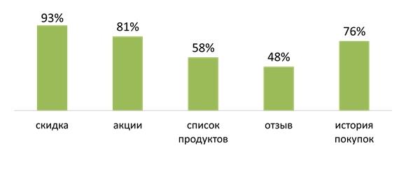 Самой популярной функцией стала виртуальная дисконтная карта, на втором месте — информация об акциях и скидках, далее: история покупок, список продуктов и отзывы на обслуживание.