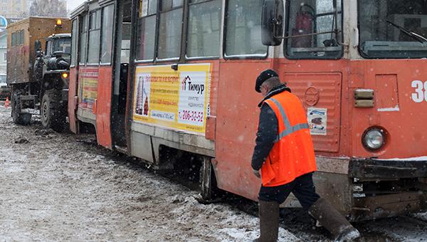 На Северной дамбе в Перми 1 декабря произошла авария — с рельсов сошёл трамвай маршрута №7, двигавшийся по направлению к цирку.
