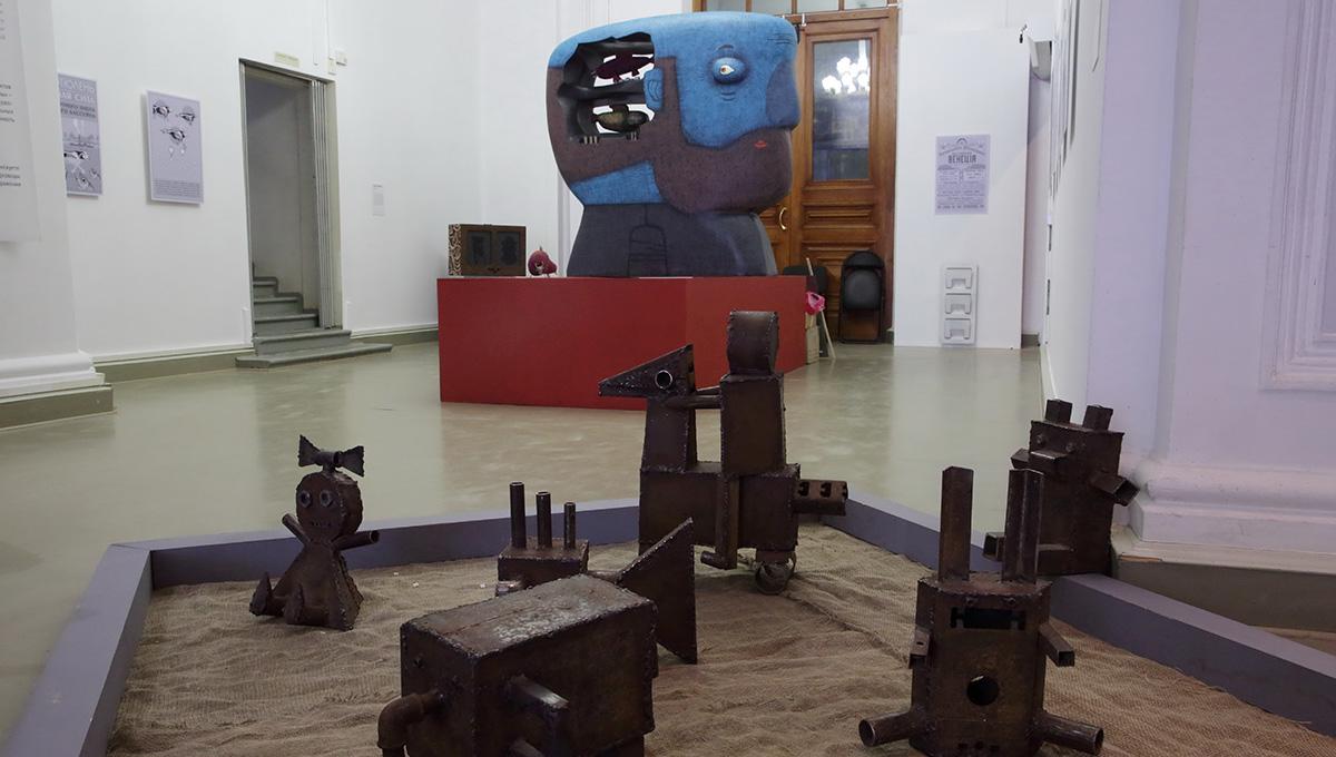 Объекты, иллюстрирующие эти байки, не менее затейливы. Выставка открывается инсталляцией пермской арт-группы КУБ под названием «Комендант биостанции». Это огромная голова из папье-маше, в которой вертятся пробирки с какими-то составами, а также фигурки животных. Рядом — милейший волотюлень из валяной шерсти с бронзовыми головой и ластами. Сразу видно: Иван Иванович Фитцер-Шмитт — это голова!!!