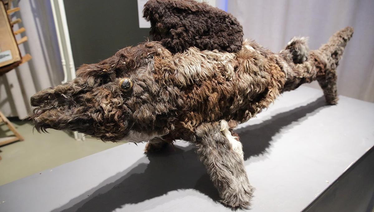 Самый популярный экспонат выставки — конечно, меховая рыба. Идея этой байки произрастает из выражения «на рыбьем меху», обозначающем холодную не по погоде одежду. Обычно так называют жалкие шубки из искусственного меха, и художник Андрей Митенёв решил вернуть рыбе её мех. Он сшил чучело рыбы из старых искусственных шуб и приделал умилительные пуговичные глаза. А кроме того, соорудил здоровенную книгу, которую можно и нужно листать и читать: там вся история волжских меховых рыб с уморительными иллюстрациями: вот «Дама с горностаем», вместо горностаевой горжетки — зубастая рыбья; вот кустодиевский купец в шубе буквально на рыбьем меху, вот Шаляпин с известного портрета, на плечах — опять рыбий мех…