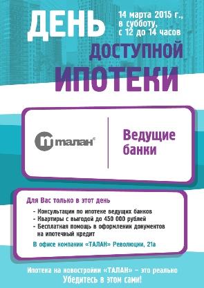 День доступной ипотеки пройдёт 14 марта с 12:00 до 14:00 в офисе продаж компании «Талан» на ул. Революции 21а.