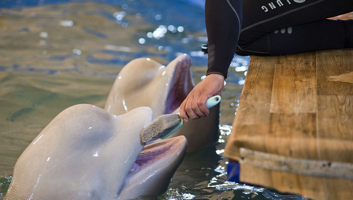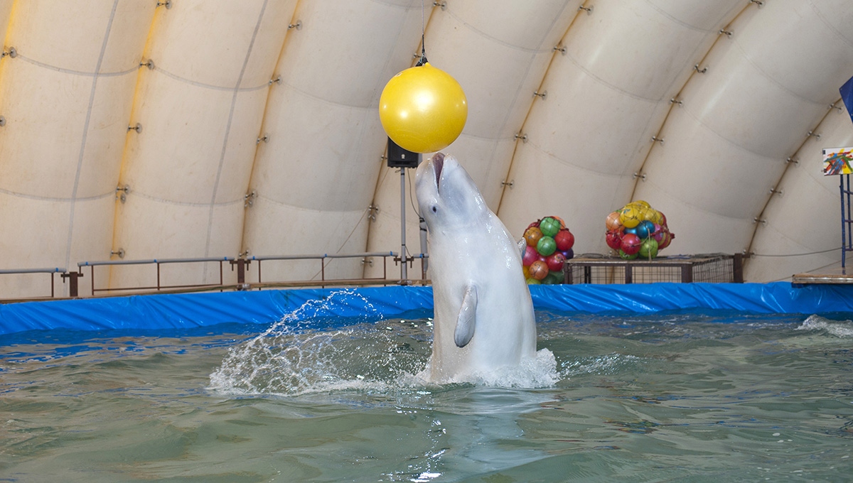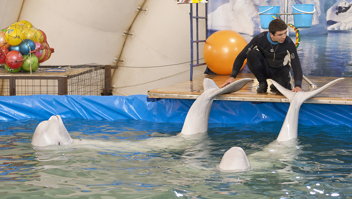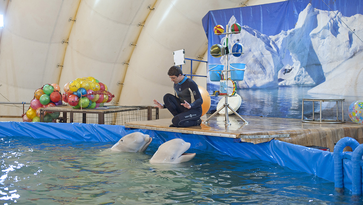 — У нас бассейн 300 тонн воды. В него засыпается около 15 тонн соли. Вода на 90% приближена к морской. Каждый день берутся анализы воды. Если что-то не в порядке, это сразу устраняется. Два дельфина-белухи съедают в общей сложности 50 кг еды в день и котик — около 10 кг в день. Мы покупаем рыбу на оптовых базах, сейчас работаем с компанией «Уралрыба» Все соответствующие сертификаты у нас есть.