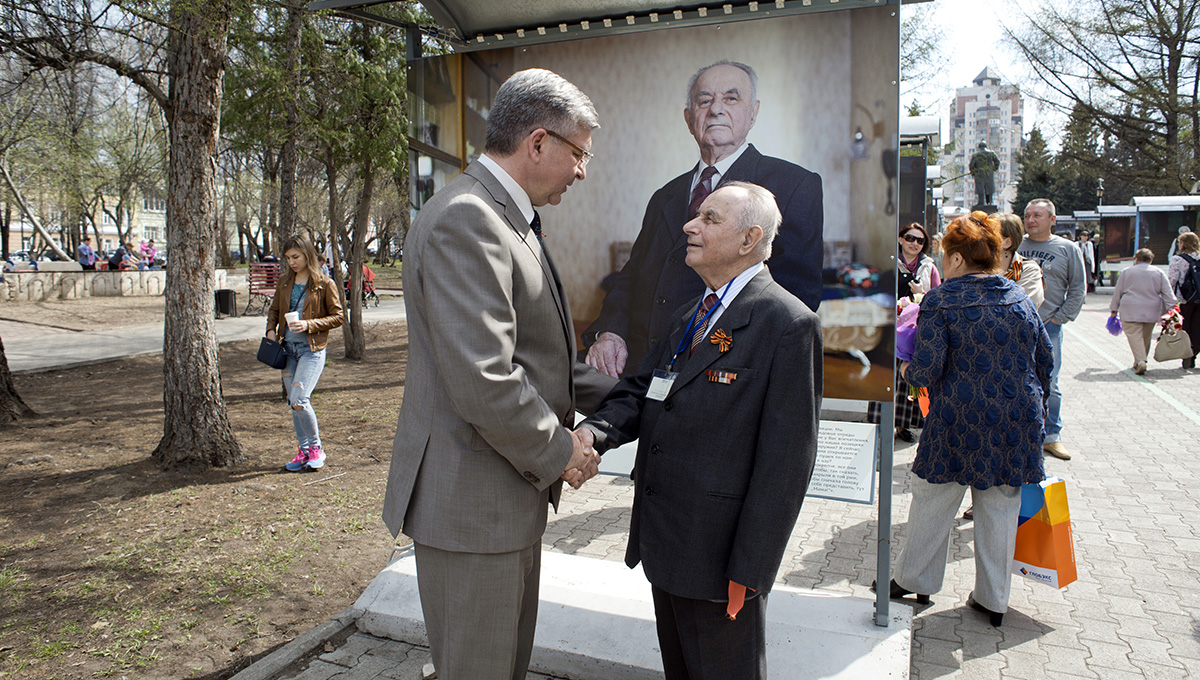 На открытие выставки 5 мая собрали всех героев, их семьи. Поздравили, подарили фрукты и конфеты от спонсора и предоставили свободный микрофон. И тут ветераны «отожгли»: и воспоминаниями делились, и песни пели, и стихи читали. У многих была потребность выйти «в мир», пообщаться с людьми. Для журналистов, особенно телевизионщиков, просто благодать: общительные, благодарные собеседники, да ещё на фоне собственных фотопортретов.