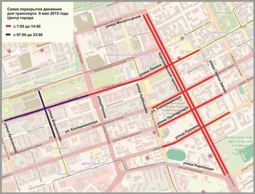 Для прохождения праздничного парада 9 мая движение транспорта будет перекрыто с 07:00 до 14:00 для всех видов транспорта, кроме трамваев, а с 12:00 до 14:00 и для трамваев — по Комсомольскому проспекту, улицам Пушкина, Луначарского, Екатерининской, Ленина, Борчанинова.