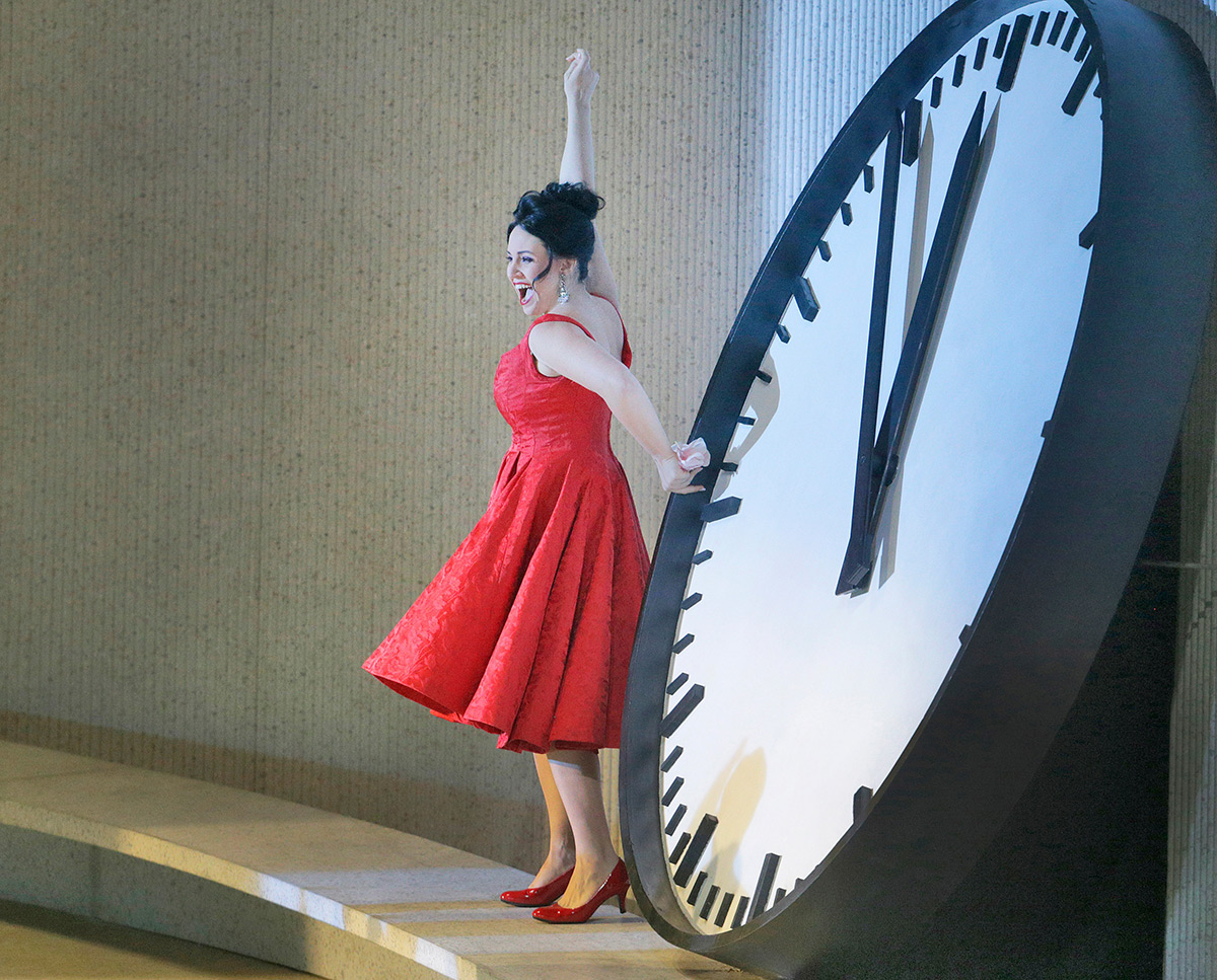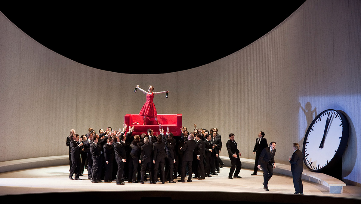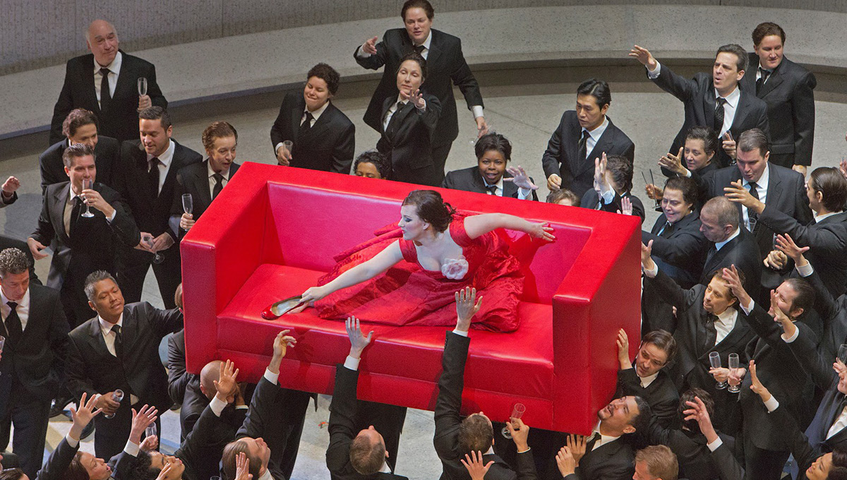 Главный дирижер Мет Фабио Луизи проведёт за пультом эту романтическую трагедию Верди, одну из самых любимых во всем мире опер, поставленную Вилли Деккером. Его режиссёрское решение очень театрально и эффектно, достаточно сказать о цветовом контрасте чёрных костюмов, в которые одеты все, и единственного ярко-красного платья Виолетты, или о вездесущих часах, отсчитывающих оставшиеся часы жизни Виолетты. Не случайно премьера этой постановки в Мет в 2010 стала настоящим «гвоздём сезона».