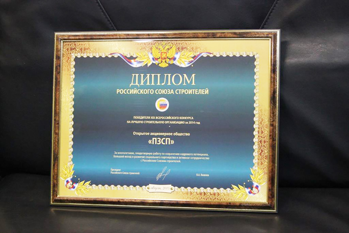 Кроме того, в рамках прошедшей церемонии ОАО «ПЗСП» было удостоено Диплома Российского союза строителей — за многолетнюю плодотворную работу по сохранению кадрового потенциала и большой вклад в развитие социального партнерства.