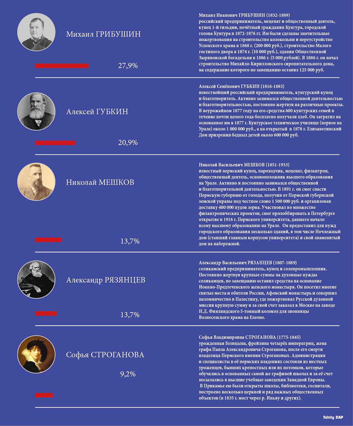 На заседании рабочей группы по реализации проекта «История российского предпринимательства» 7 августа 2015 года подведены предварительные итоги голосования в рамках всероссийской акции «100 великих предпринимателей и меценатов». Жителям Пермского края предлагалось выбрать из 15 фамилий пять предпринимателей живших и работавших на территории Пермской губернии.