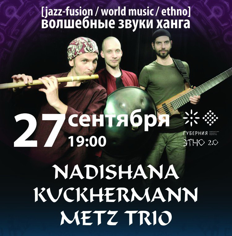 Надишана Трио (16+) — новаторы и экспериментаторы фьюжн- и современной этномузыки. Организаторы концерта уверяют, что зрителей ждёт полное погружение в магические звуки ханга, этнических флейт и перкуссионных инструментов. На концерте прозвучат авторские музыкальные инструменты, существующие в единственном экземпляре и не имеющие аналогов в мире.