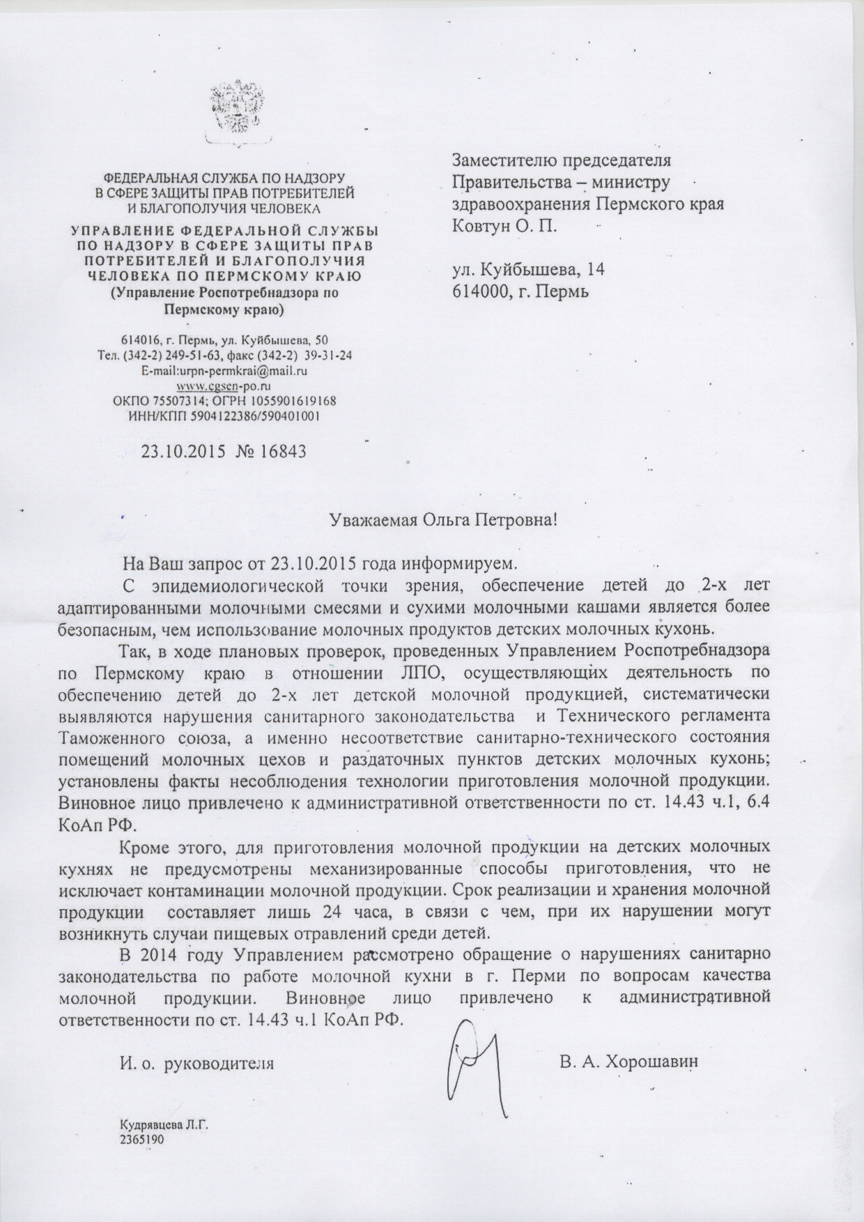 «Для приготовления молочной продукции на детских молочных кухнях не предусмотрены механизированные способы приготовления, что не исключает контаминации молочной продукции. Срок реализации и хранения молочной продукции составляет 24 часа, в связи с чем при их нарушении могут возникнуть случаи пищевых отравлений среди детей», — говорится в письме и. о. руководителя Управления Роспотребнадзора по Пермскому краю.