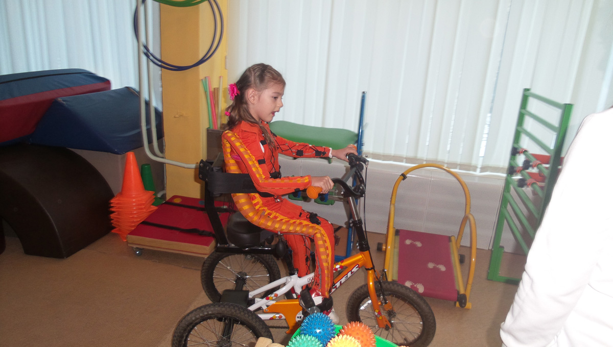 «Наш реабилитационный центр и его оборудование мы везде ставим в пример, — рассказывает Светлана Шлегель, мама маленькой Даши. — Здесь появился лечебный велосипед для детей с нарушениями опорно-двигательного аппарата. В 2014 году мы вообще не думали, что будем на нём кататься. В 2015 году мы убрали с него ручку, за которую я должна была вести Дашу. И она сама села и поехала».