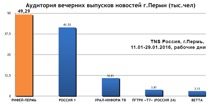 На каком же канале пермяки предпочитают узнавать городские новости? На этот вопрос ответ дает международная исследовательская группа TNS Россия. Согласно её исследованию, в январе 2016 года по будням с 19:00 до 19:30 «Рифей-Пермь» смотрели в среднем 49 тысяч человек в возрасте 18 лет и старше. Среди всех информационных выпусков пермских телекомпаний новости «Рифей-Пермь» занимает убедительное первое место.