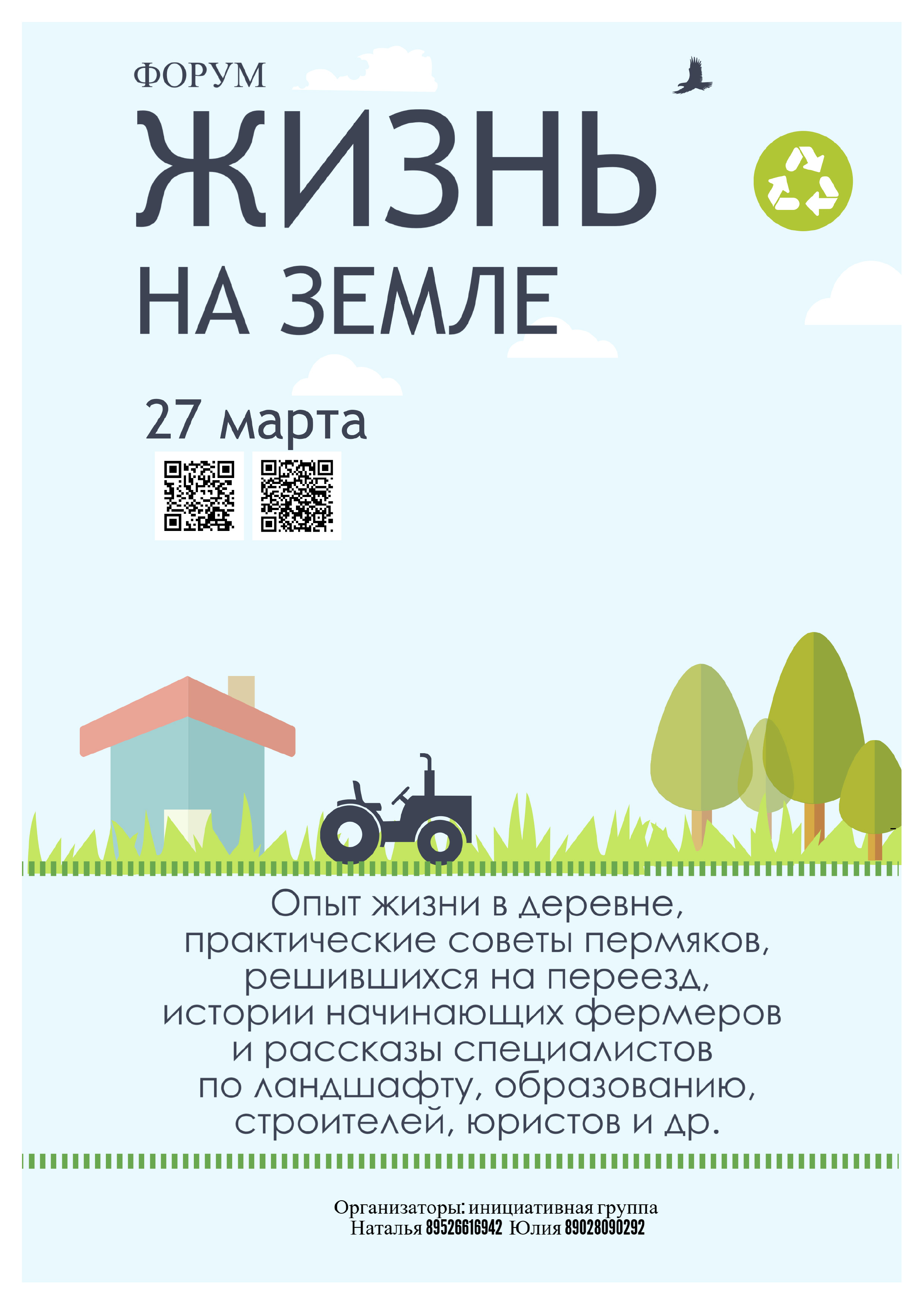 Для тех, кто планирует или пока только мечтает о переезде в сельскую местность, в Перми 27 марта 2016 года пройдёт форум «Жизнь на земле».