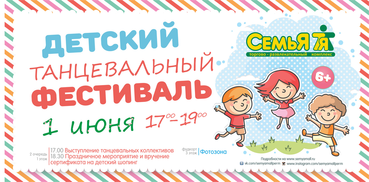 1 июня в ТРК «СемьЯ» пройдёт детский танцевальный фестиваль (6+). Праздничное мероприятие развернётся на главной сцене ТРК «СемьЯ» — на первом этаже второй очереди. Начало в 17 часов.