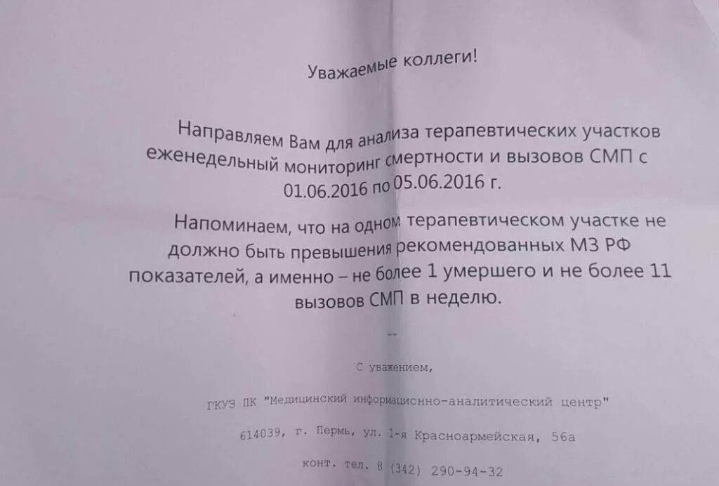 Сегодня краевой минздрав распространил пресс-релиз, в котором утверждает, что директивы, ранее разосланные министерством в государственные больницы Пермского края, в которых говорилось о том, что на одном терапевтическом участке не должно быть более одного умершего за неделю и не более 11 выездов бригад скорой помощи, оказались технической ошибкой.