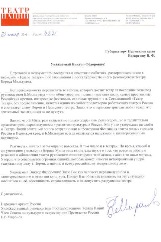 Уважаемый Виктор Федорович! Прошу Вас разобраться в этой ситуации и найти возможность восстановить Бориса Мильграма в должности художественного руководителя Пермского академического Театра-Театра.