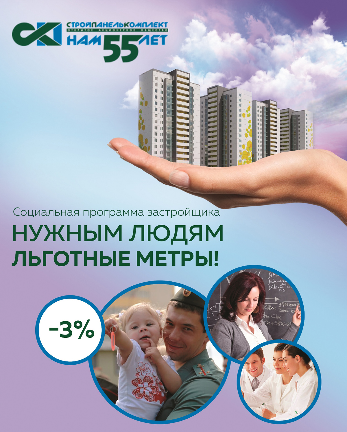 С 1 января 2017 года ОАО «СтройПанельКомплект» предоставляет скидки на квартиры работникам социальной сферы. Для тех, кто учит, лечит, создаёт безопасность и культурно обогащает взрослых и детей, застройщик предлагает 3% скидку на покупку квартиры.