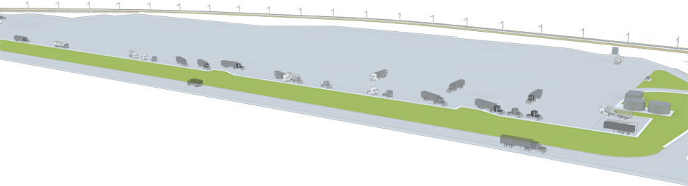 Производственно-логистический комплекс предполагает наличие парковочной зоны для легкового и грузового автотранспорта, пандусы для заезда машин в помещение, холодильные и морозильные камеры, система аварийной сигнализации и пожаротушения, встроенные административно-бытовые помещения и бетонный пол с антипылевым покрытием.