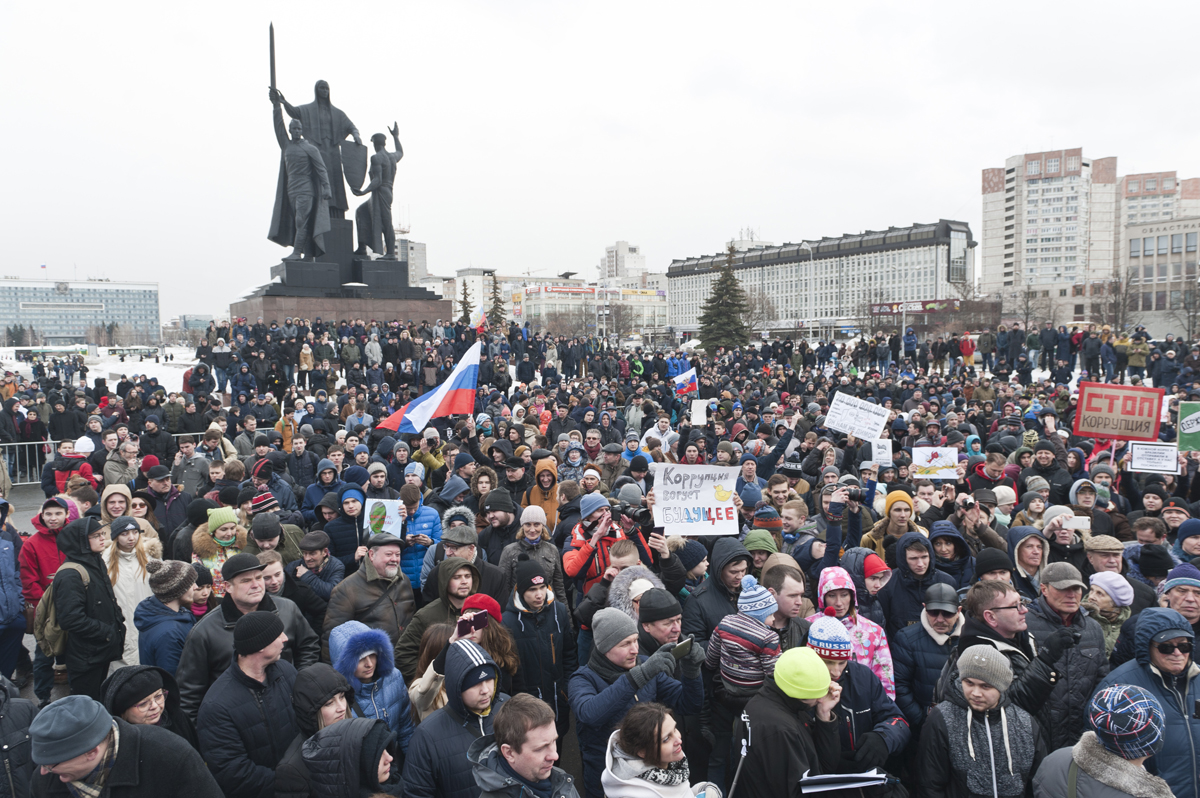 В воскресенье, 26 марта, в Перми у памятника «Героям фронта и тыла» прошёл митинг против коррупции высших должностных лиц российского государства «Требуем ответа на улицах Перми!».