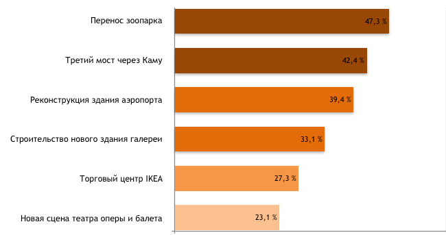 Не менее ожидаемым (42,2%) является и другой крупный инфраструктурный проект — строительство третьего моста через Каму. Этот проект волнует жителей Кировского (48,2%), Орджоникидзевского (47,0%) и Дзержинского (46,5%) районов. А наибольшую активность в этом вопросе проявили мужчины (53,6%) в возрасте 31-45 лет (45,7%), а также работники производственной сферы (57,3%).