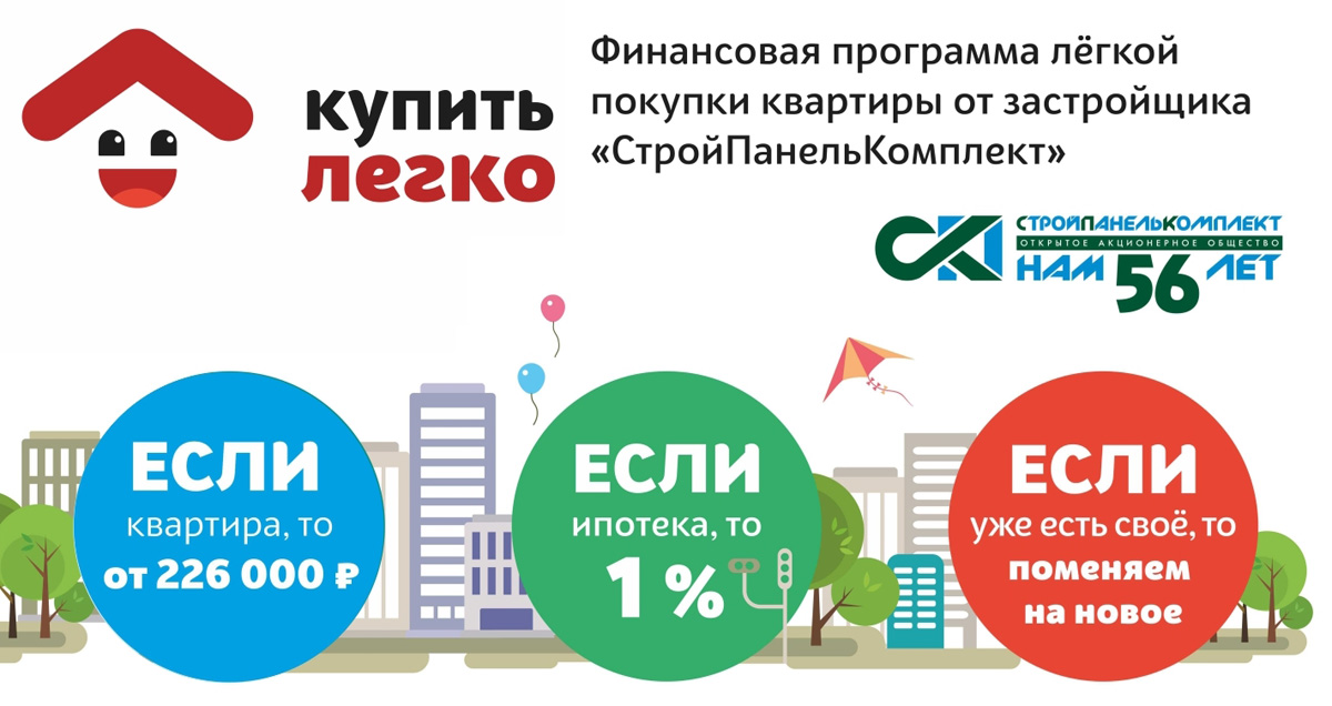«Купить легко» — это новая финансовая программа лёгкой покупки жилья от застройщика «СтройПанельКомплект». В рамках программы мы предложим вам различные финансовые решения и подберём комфортный ежемесячный платёж. Воспользуйтесь одним из них и приобретите квартиру мечты!