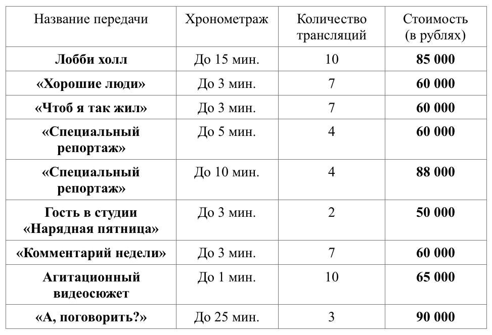 Цена указана в рублях. НДС на стоимость услуг не начисляется. Цена услуг по размещению предвыборных агитационных материалов в форме участия кандидатов, избирательных объединений в передачах СМИ «Ветта 24» включает в себя расходы на производство телевизионных передач.