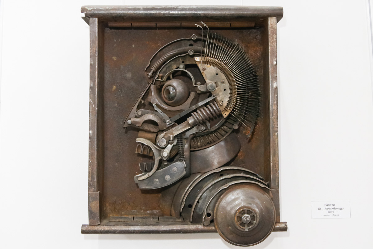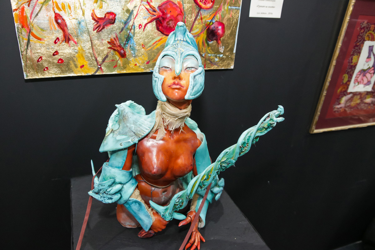 На удивление концептуально выступило в этом году Пермское отделение Союза художников России. Их стенд посвящён 100-летию Октябрьской революции, и подобная направленность для СХ не впервой: в 2015 году они посвятили свою экспозицию юбилею Победы в Великой Отечественной войне; но если военная выставка была выдержана в серьёзном, строгом стиле, то нынешняя — постмодернистски ироничная и в то же время очень философская.
