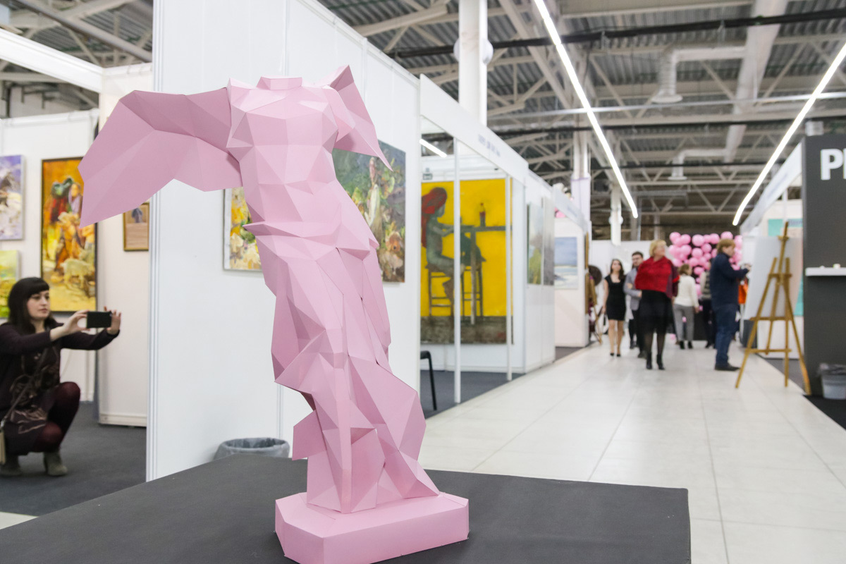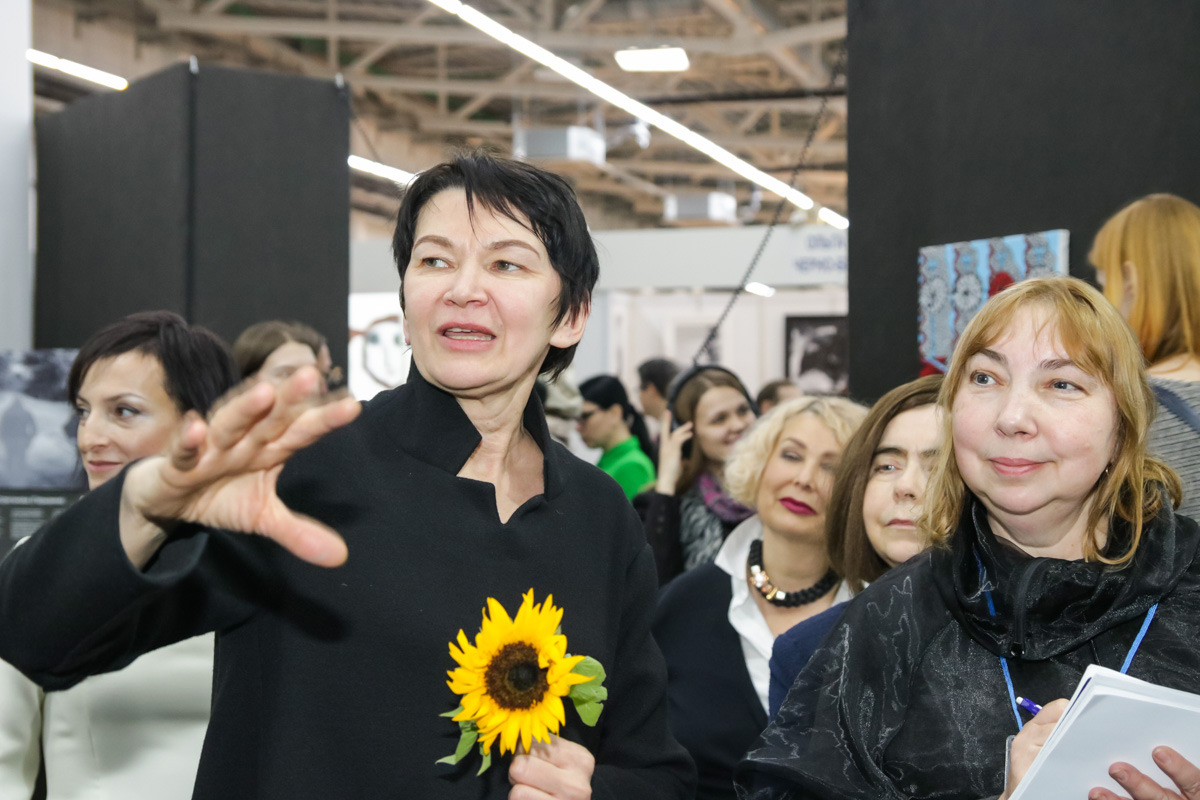 Но это не всё. Прямое высказывание есть прямое высказывание: на протяжении всей работы «Арт-Перми» на стенде ЦГК проходят перформансы, и первым стал перформанс Елены Рэмбо «Высокое пермское искусство»: художница залезла на перегородку между стендами, элегантно устроилась там и громко взывала к творцам. Видимо, требовала поднять искусство на высоту!