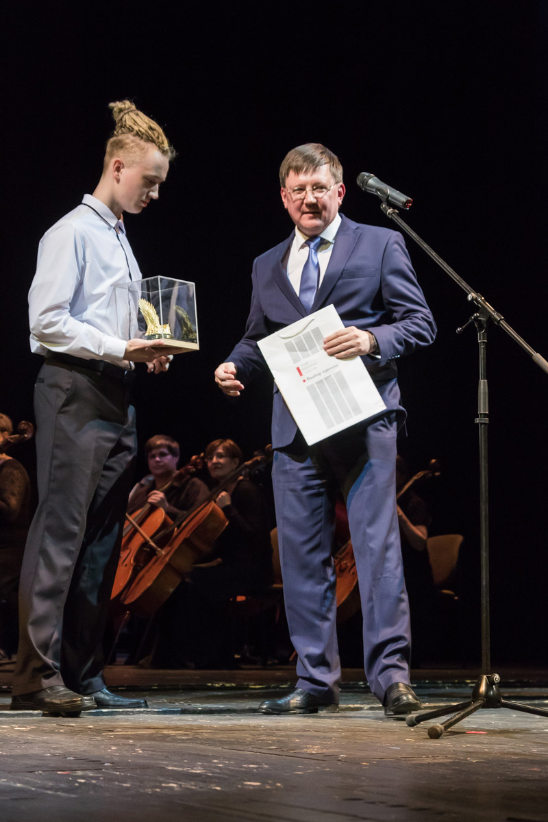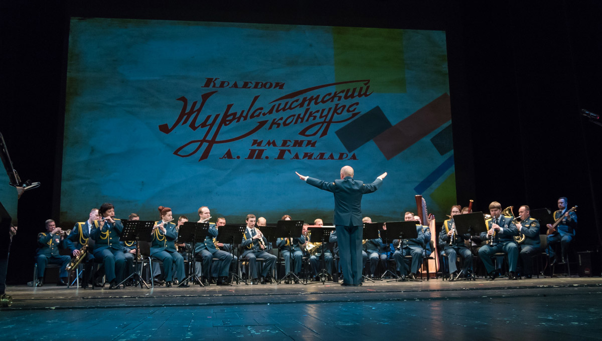 После символического перерыва — занавес закрылся и снова раскрылся — сцена разительно изменилась. Другой стиль, и оркестр — тоже другой! Музыкальное сопровождение церемонии вручения премий имени Гайдара осуществлял Пермский губернский духовой оркестр под руководством полковника Евгения Тверетинова, который начал с бодрого исполнение песни «Гайдар шагает впереди».