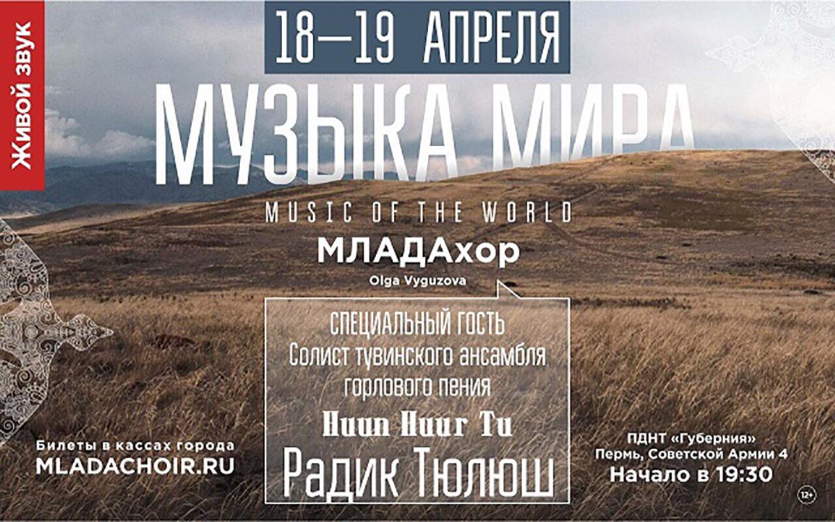 Пермский хор «Млада» приглашает зрителей на концерт «Музыка мира» (6+). Программа включает несколько блоков: музыка ближнего зарубежья, Европы, Азии, Северной и Латинской Америки. Специальный гость концерта — солист тувинского ансамбля горлового пения HUUN HUUR TU Радик Тюлюш.