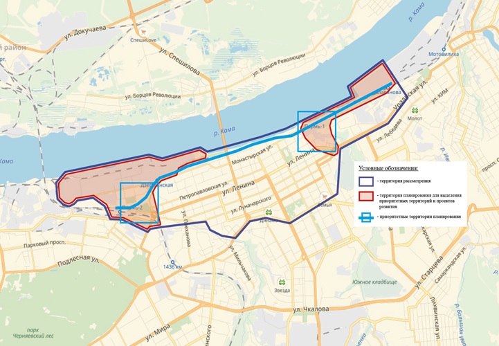 Градостроительную концепцию требуется разработать, чтобы создать узнаваемый образ центральной части города и сформировать единое градостроительное пространство территории с учётом самобытности и особенностей развития её отдельных частей. Площадь территории рассмотрения составляет около тысячи гектаров. Согласно карте, под планирование выделены части центра Перми, которые находятся в Дзержинском и Мотовилихинском районах.