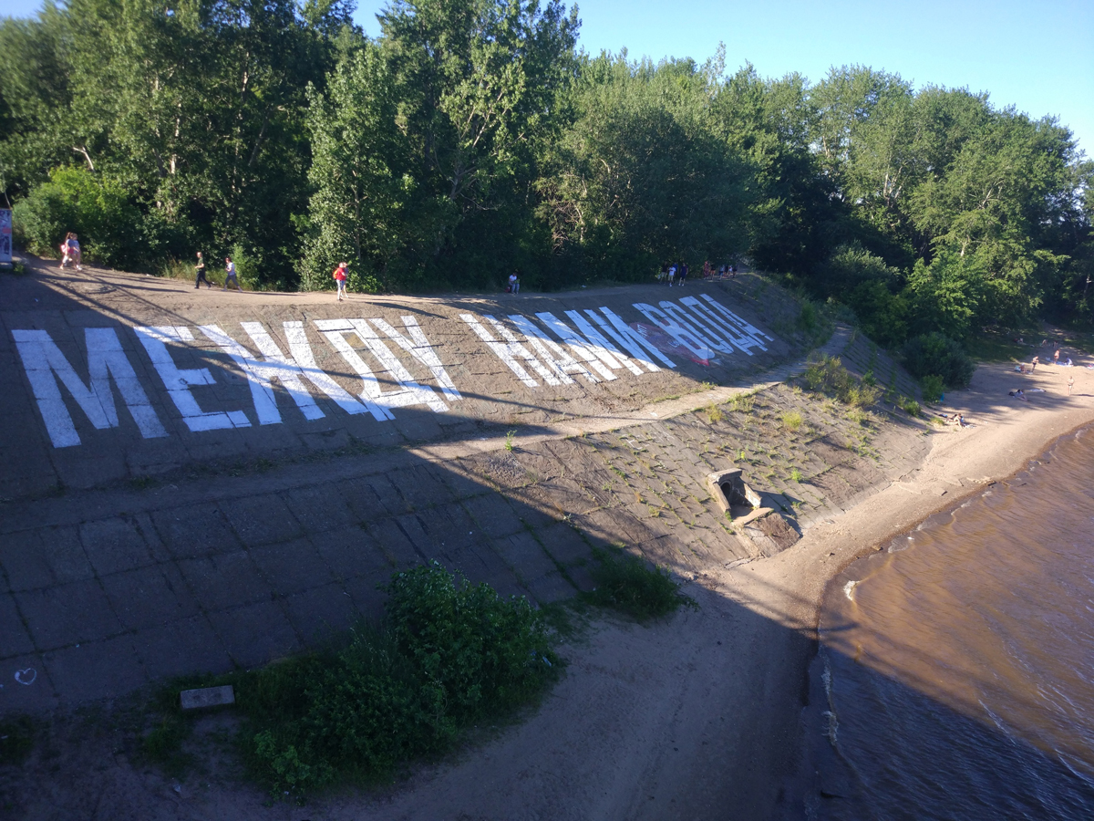С помощью трафаретов, баллончиков, краски художники из команды ОПГ ГРУБА51 сделали граффити «Между нами вода». Надпись находится на улице Борцов революции, на противоположном берегу Камы.