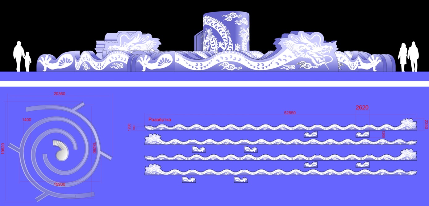 1) Горка «Дао» 2) Горка «Великая стена» 3) Горка «Замок белой Цапли» 4) Горка «Терракотовый воин» 5) Горка «Чайная церемония» 6) Горка «Театр Кабуки» 7) Горка «Шёлковая ширма» 8) Лабиринт-катушка «Инь янь» 9) Скульптурные группы «Часовня» и «Рождественский вертеп» 10) Скульптурная группа около новогодней ели «Дед Мороз и Снегурочка»