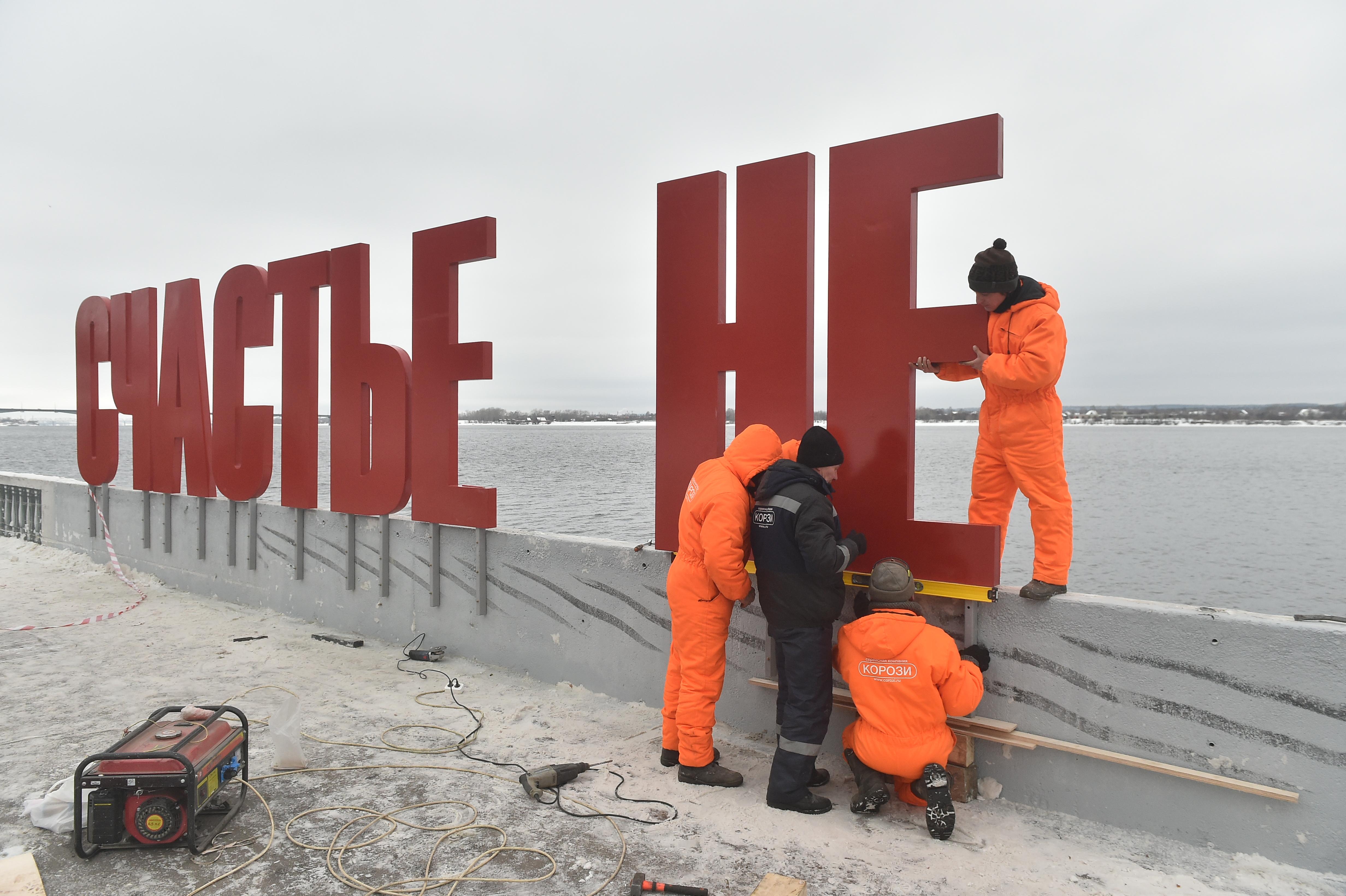 Отремонтированный арт-объект также сделан из фанеры, но подход к креплению и монтажу иной. Так, металлический каркас букв сделан из толстостенной металлической трубы, а буквы — из влагостойкой фанеры. Готовые конструкции букв прикреплены при помощи распорных анкеров к существующему бетонному ограждению набережной, которое прежде было очищено и покрашено вновь. Само место установки объекта теперь находится под видеонаблюдением.