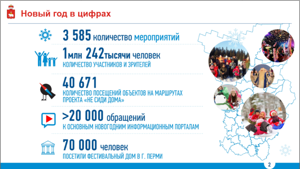Начальник департамента культуры и молодёжной политики администрации города Перми Елена Неганова рассказала о том, как прошли новогодние праздники в Перми и как прошёл первый в истории «Новогодний маршрут». По её словам, праздничные мероприятия в Перми посетили почти 1,1 млн человек. Из них 500 тыс. — прогулялись по локациям «Новогоднего маршрута», 380 тыс. человек посетили ледовый городок, на бесплатных рождественских каруселях прокатились 19,2 тыс. детей, а зимний кубок ледовой скульптуры «Зимний вернисаж» собрал более 20 тыс. зрителей.