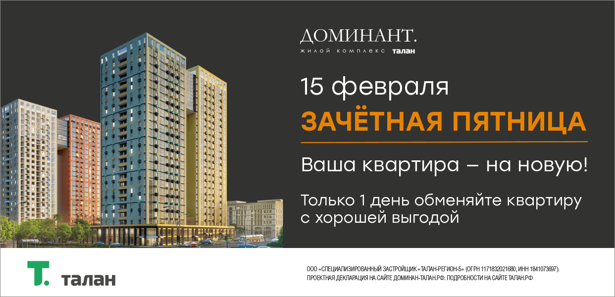 «Талан» вновь проводит уникальную для Перми акцию «Зачётная пятница». 15 февраля пермяки смогут обменять своё жильё на новую квартиру в жилом комплексе «Доминант» на Луначарского, 99 или в семейном квартале «Счастье» на Карпинского, 50.